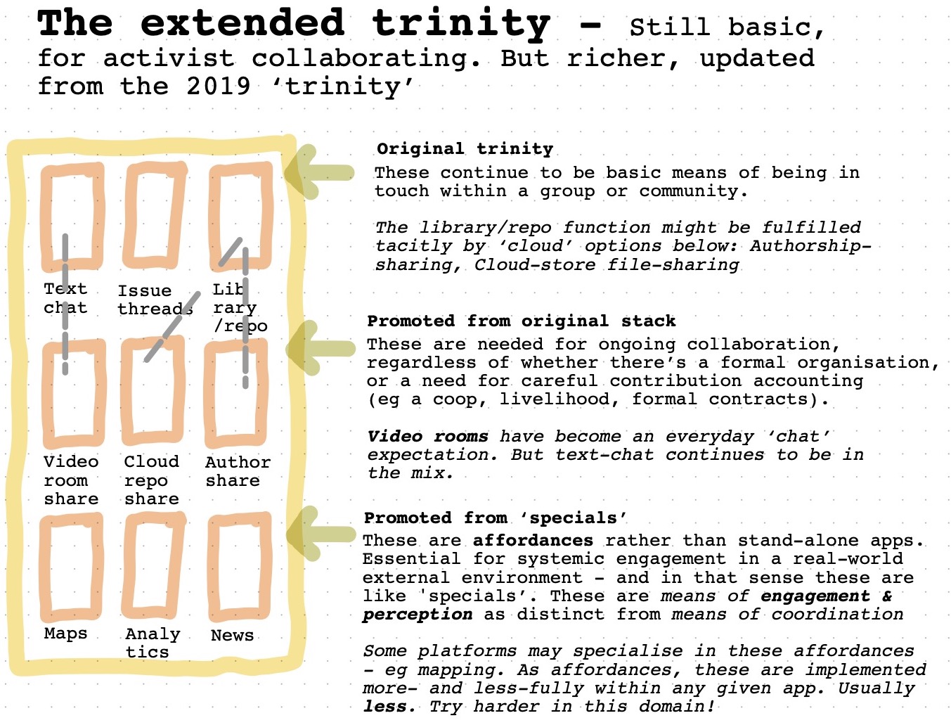 The framing as 'an extended trinity' is a historical legacy that we probably should leave behind (but aware of it's evolutionary origins). The extended trinity comprises three trios: nine categories in total. So to move forward, we'll adopt a notion of a 'gang of nine': nine kinds of tooling that are implicated in digitally mediated organising, collaborating and facilitating. One way or another, it will be best to have some tooling in each of the nine categories, mobilising and practically integrating all the nine 'families' of FLOSS tools into collective working. Gang of nine