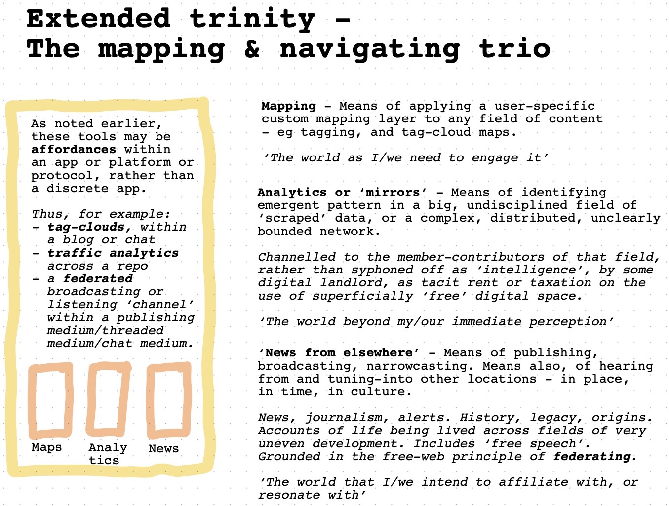 # Trio 3 - Tools for mapping and navigating The third trio of tools in an extended trinity comprises means for supporting the active engagement of the members of the collaborating community, with their common context, and for locating themelves in relation to their environment. In this sense they're similar to tools that we regard as being in the 'specials’ category: supporting a specific rather than a generic kind of engagement of a community.